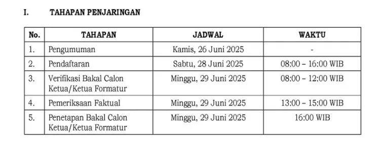 Setelah itu, dilanjutkan dengan proses pendaftaran bakal calon ketua pada Sabtu, 28 Juni 2025 mulai pukul 08.00 hingga 16.00 WIB.Agenda berlanjut pada Ahad, 29 Juni 2025, di mana akan dilakukan beberapa tahapan penting secara simultan.