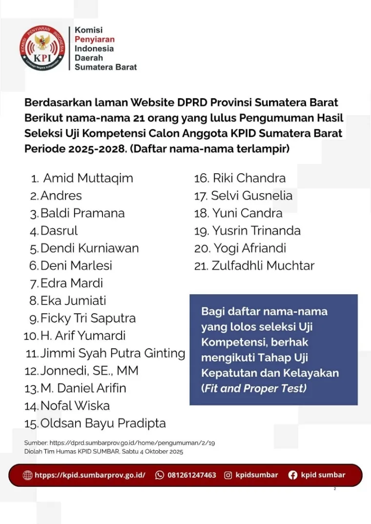 PADANG (2/10/2025) - Panitia Seleksi (Pansel) calon anggota Komisi Penyiaran Indonesia Daerah (KPID) Sumatera Barat, serahkan 21 nama untuk dipilih Komisi I DPRD Sumbar sebagai calon komisioner lembaga pengawas isi siaran itu untuk periode 2025-2028.
